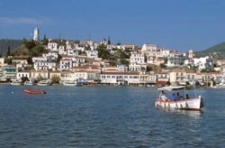 Poros is a volcanic island, formed through the union of two smaller islands, Kalouria and Sphaena. It lies in close proximity to the Argolid, separated from the Peloponnese by an extremely narrow channel. Archaeology buffs will want to visit the scant remains of the Sanctuary of Poseidon, 5 km. from the town ol Poros on the road to the Monastery ol Zoodochos Pigi. The sanctuary in situated, like so many ancient temples, amidst the most beautiful setting on the island. It dates to the 6th century B.C. and was the centre of the Kalaurian League, a maritime confederation formed by Ermioni, Epidaurus, Natplio, Aigina, Athens and Orchomenos. It was also a reluge for the shipwrecked and persecuted. It was here that Demosthenes is said to have drunk poison after having been cornered by his enemies in 322 B.C Built up the sides of a small hill, the town of Poros has the blue woodwork and white walls so typical of Greek island architecture.
