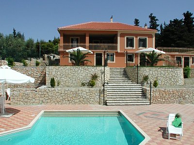 Exterior Finally at the distant horizon the guest can see the village of Exoghi with the picturesque little houses climbing the mountain. The estate has extended gardens and small “reading and thinking” corners and a whole small forest of cypress trees. Just beneath the main house down a few steps, lays a big bean shaped pool, with lot’s of space for sunbathing and relaxation. A bar, a breakfast area and a barbeque are the finishing touches at the surroundings of the estate.
